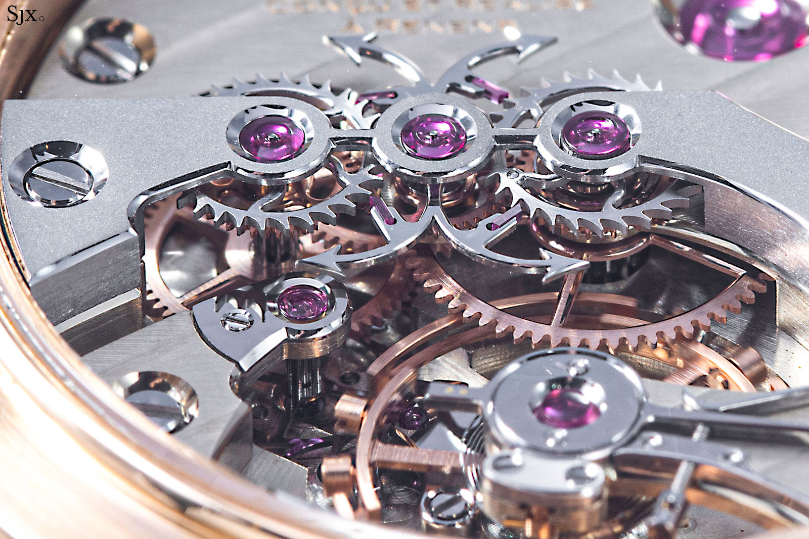 Defined by the four sharp arrowheads on the two-sided anchor, the deadbeat seconds mechanism has an intricate, old-school construction that brings to mind an earlier era of watchmaking – perhaps early 20th century or even 19th century. Unsurprisingly, that is where its origins lie: the mechanism is modelled on one invented by Robert Gafner, who taught at the La Chaux-de-Fonds watchmaking school in the 1940s.