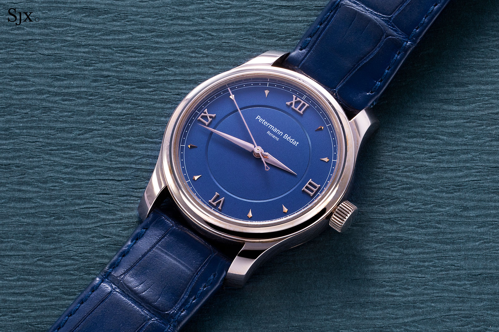 Rather than massaging the earlier design into better shape, Petermann Bedat ditched it in favour of what you see here. Best described as a modern take on the fashionably retro “sector” dial, the dial looks good and also shows off the brilliant finishing.